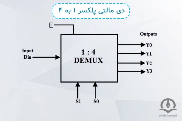 در این demux ما ۱ ورودی، ۴ خروجی و ۲ پایهی انتخاب داریم، به این دی مالتی پلکسر به دلیل داشتن ۲ پایهی انتخاب و ۴ خروجی دی مالتی پلکسر ۳ به ۴ نیز میگویند. در شکل زیر میتوانید دیاگرام دی مالتی پلکسر ۱ به ۴ را مشاهده کنید.