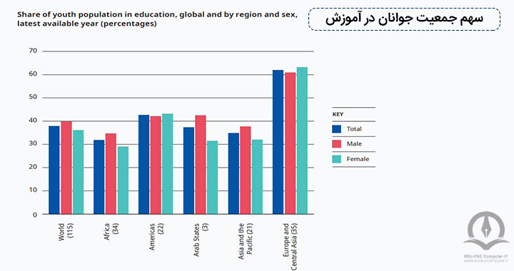 سهم جمعیت جوان جهان و نیز هر قاره در آموزش تا سال 2020 (منبع):