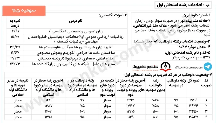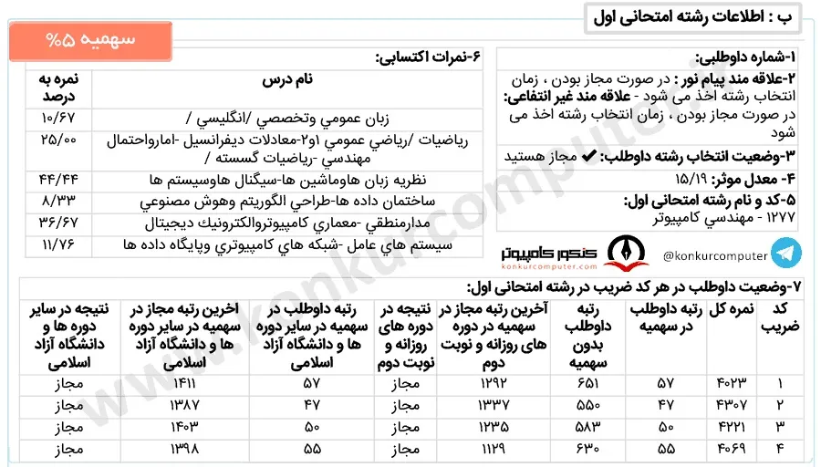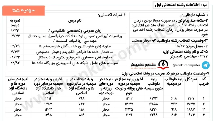 کارنامه قبولی شبکه های کامپیوتری روزانه دانشگاه علم و صنعت با سهمیه ۵ درصد