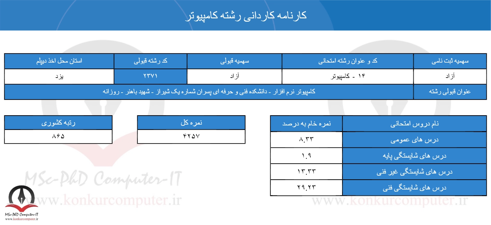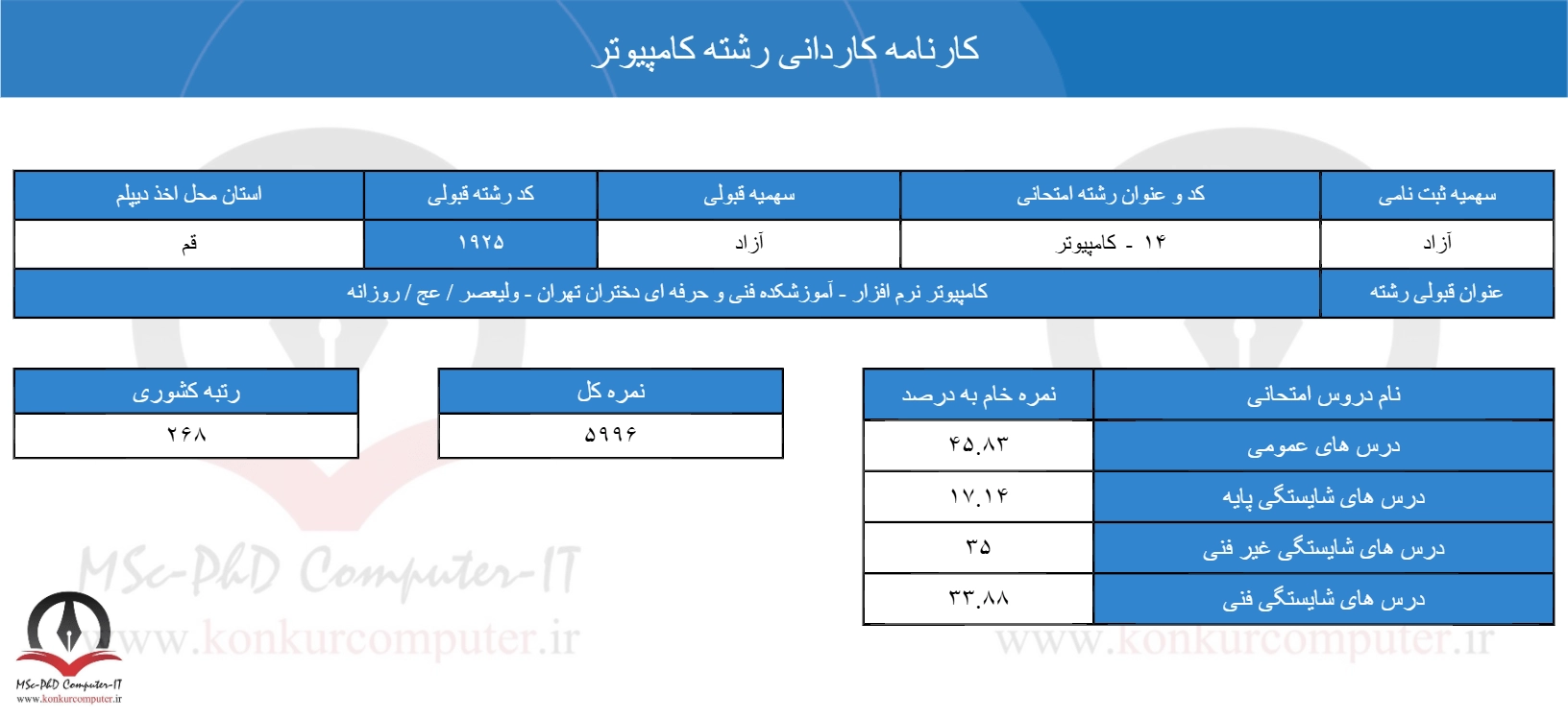 در ادامه به نمونه کارنامه های قبولی رشته فنی و حرفه ای کامپیوتر در چهار سال اخیر پرداخته میشود: