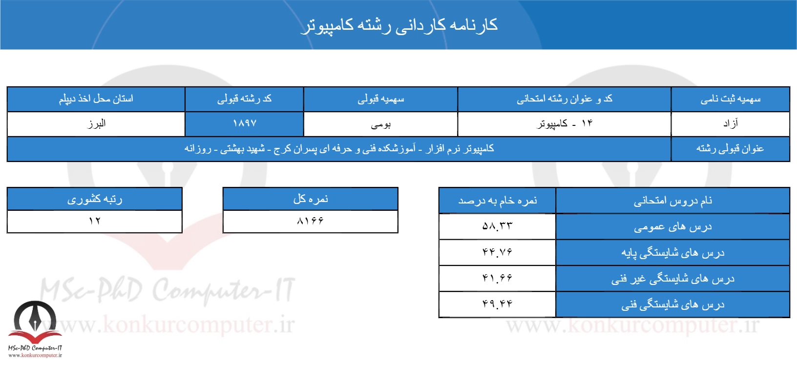 نمونه کارنامه های قبولی کاردانی کامپیوتر 1500 تا 1403