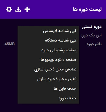 - حذف دوره : این گزینه باعث حذف دوره از لیست دورههای برنامه خواهد شد ولی باعث حذف فایلهای دوره نخواهد شد. اگر قصد دارید دوره را به طور کلی پاک کنید ابتدا فایلها را حذف و سپس این گزینه را انتخاب نمایید.