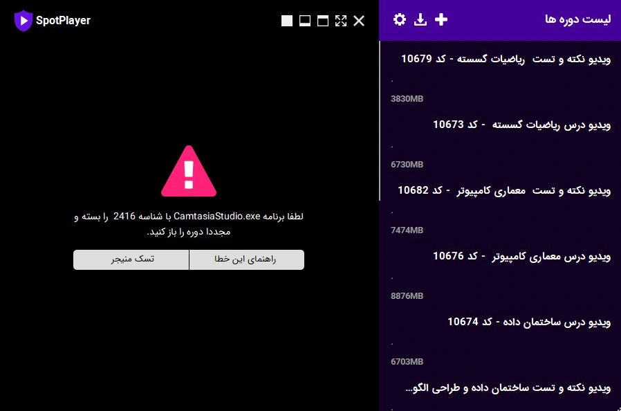 اگر در هنگام پخش ویدیوای از دوره نرم افزارهای غیر مجازی که برای SpotPlayer تعریف شده است (مانند نرم افزارهای Screen Recorder یا نرم افزارهای اتصال از راه دور مانند AnyDesk) اجرا شود، خطایی به شکل زیر دریافت خواهید کرد: