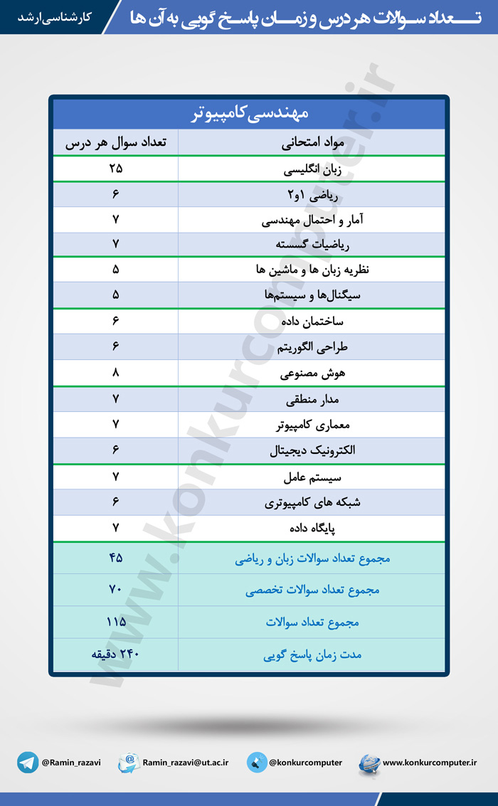 اطلاعات بالا را میتوانید بصورت مصور در عکسی که در بالای صفحه قرار داده شده است مشاهده کنید، در این عکس تعداد سوالاتی که از هر درس در کنکور ارشد کامپیوتر مطرح میشود و همین طور زمان پاسخ گویی به سوالات کنکور ارشد کامپیوتر مشخص شده است.