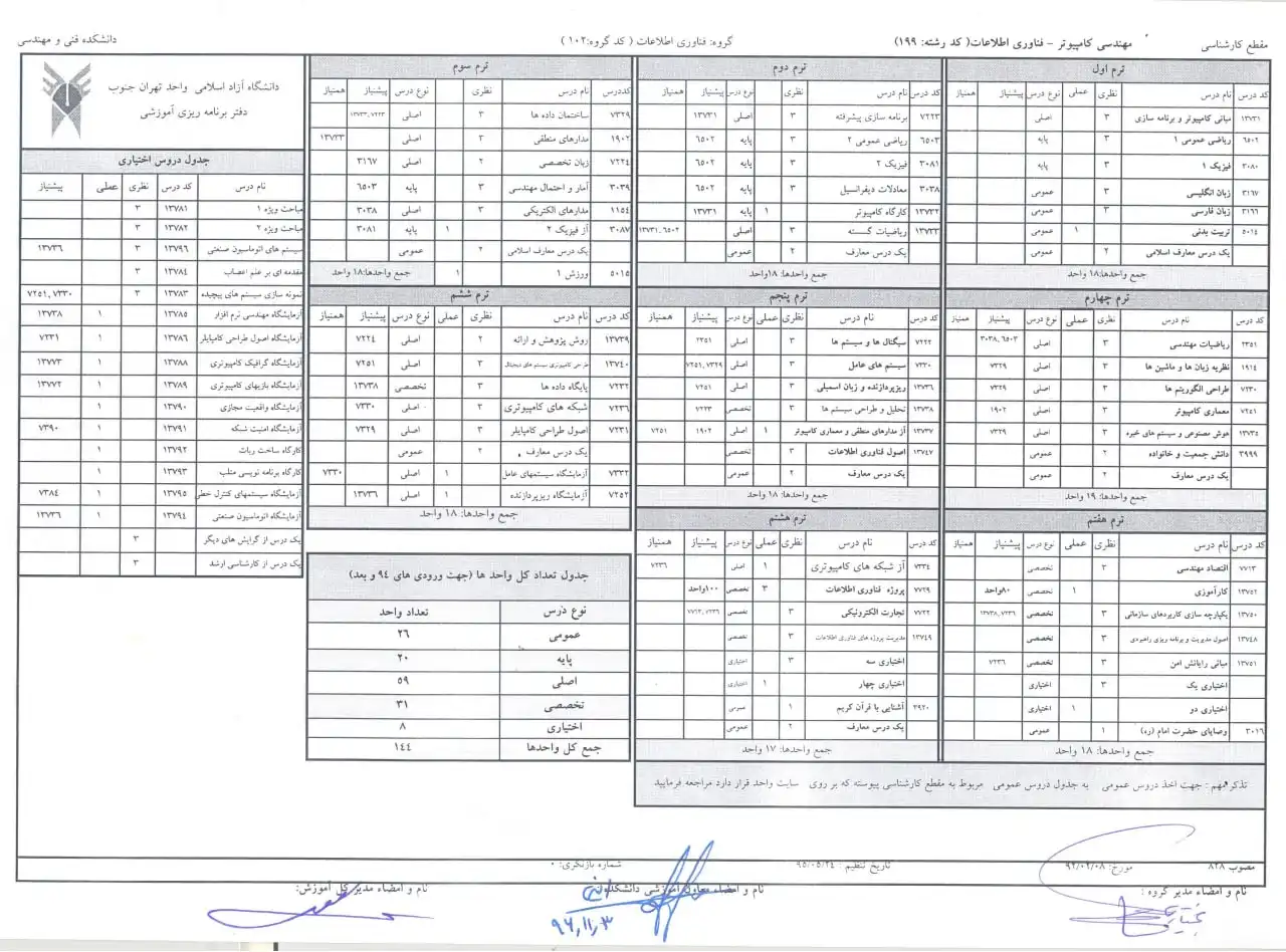 | مهندسی نرمافزار | تحلیل و طراحی نرمافزار، طراحی پایگاه دادهها، مهندسی نرمافزار، آزمایشگاه مهندسی نرمافزار، ایجاد چابک نرمافزار، آزمون نرم افزار، برنامهسازی وب |