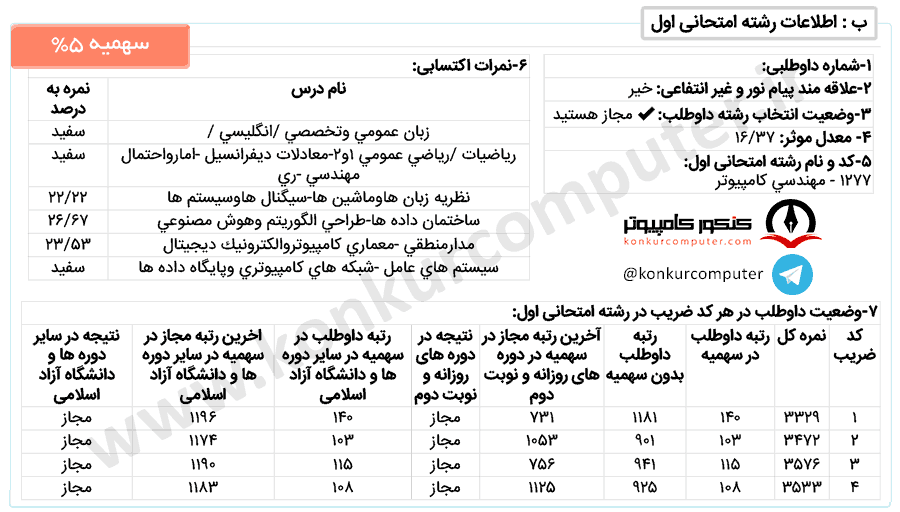 برای اینکه داوطلبان کنکور ارشد کامپیوتر 1401 بتوانند انتخاب رشه دقیقی داشته باشند دو مورد را در این صفحه لحاظ کردیم، مورد اول اینکه محل قبولی تمامی کارنامه ها را برای شما آورده ایم و مورد دوم اینکه سعی کردیم تا رتبه های بد و محل قبولی آنان را برای شما بیاوریم تا تمامی رتبه ها بتوانند به خوبی از این صفحه استفاده کنند. با مشاهده محل قبولی هر دانشجو میتوانید تخمینی از آخرین رتبه قبولی در کنکور ارشد کامپیوتر در هر دانشگاه داشته باشید و از این اطلاعات فوق العاده در انتخاب رشته تان استفاده کنید.