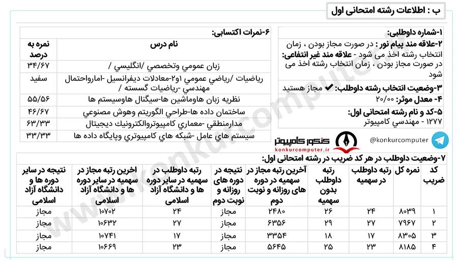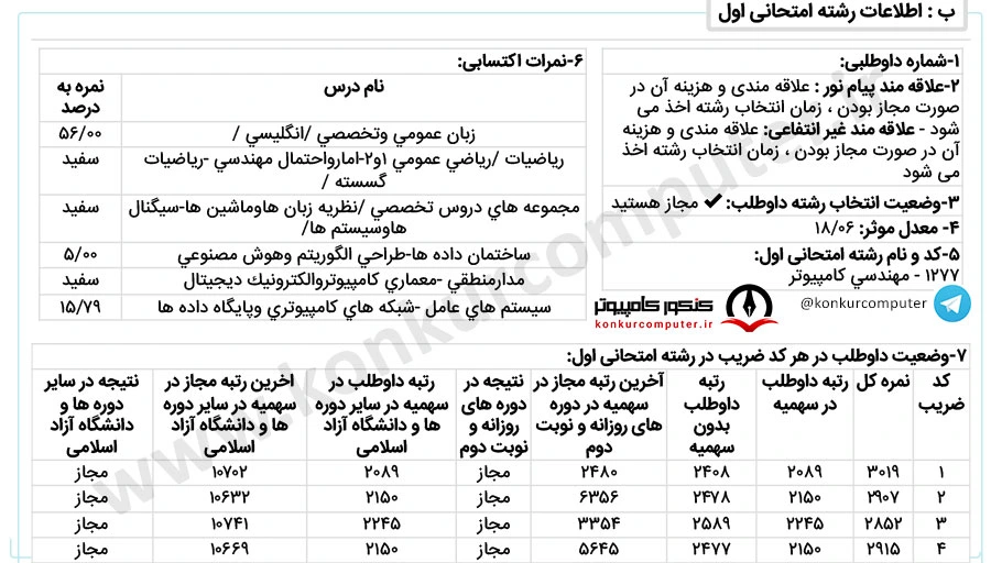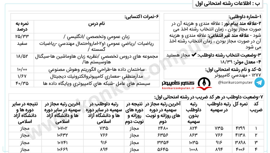 توجه: متاسفانه مشاهده شده که سایتها و موسساتی بصورت زیرکانه از کارنامههای سالهای قبل بدون نام سایت کنکور کامپیوتر استفاده کردهاند (بعنوان مثال رتبه های نرم افزار کارنامه ها را کنار هم قرار داده اند و جداگانه اعلام کردهاند)، هر گونه استفاده از کارنامههای درون سایت بدون نام بردن منبع غیر مجاز و از نظر شرعی حرام است.