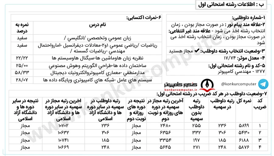 برای اینکه داوطلبان کنکور ارشد کامپیوتر 1404 بتوانند انتخاب رشته دقیقی داشته باشند دو مورد را در این صفحه لحاظ کردیم، مورد اول اینکه محل قبولی تمامی کارنامه ها را برای شما آورده ایم و مورد دوم اینکه سعی کردیم تا رتبه های بد و محل قبولی آنان را برای شما بیاوریم تا تمامی رتبه ها بتوانند به خوبی از این صفحه استفاده کنند. با مشاهده محل قبولی هر دانشجو میتوانید تخمینی از آخرین رتبه قبولی در کنکور ارشد کامپیوتر در هر دانشگاه داشته باشید و از این اطلاعات فوق العاده در انتخاب رشته تان استفاده کنید.