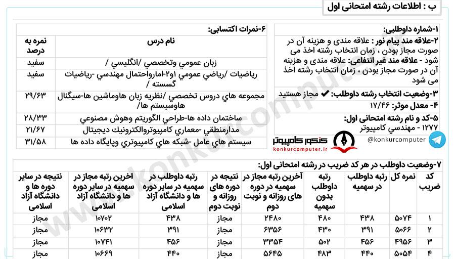 با توجه به اینکه بیشترین قبولی های کنکور ارشد کامپیوتر و آی تی با اختلاف بسیار زیاد نسبت به دیگر موسسات متعلق به ما بوده و تعداد کارنامه های بسیار زیادی را در اختیار داریم این صفحه را برای شما داوطلبان کنکور ارشد کامپیوتر 1404 به طور غیر قابل وصفی کامل و جامع ساخته ایم، لازم است به این نکته اشاره شود که به علت تعداد زیاد کارنامه ها فقط بخشی از آنها که به شما دانشجویان عزیز کمک میکند و اطلاعات مفیدی در اختیار شما میگذارد را برایتان قرار داده ایم و از قرار دادن رتبه های نزدیک به هم خود داری کردهایم زیرا قرار دادن همه کارنامه ها هم اطلاعات تکراری به شما میداد و هم لود این صفحه را دچار مشکل میکرد.