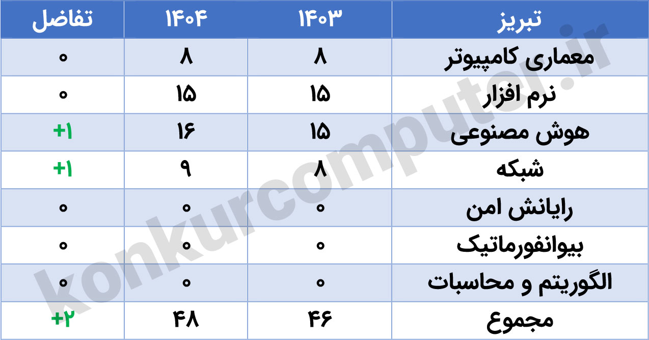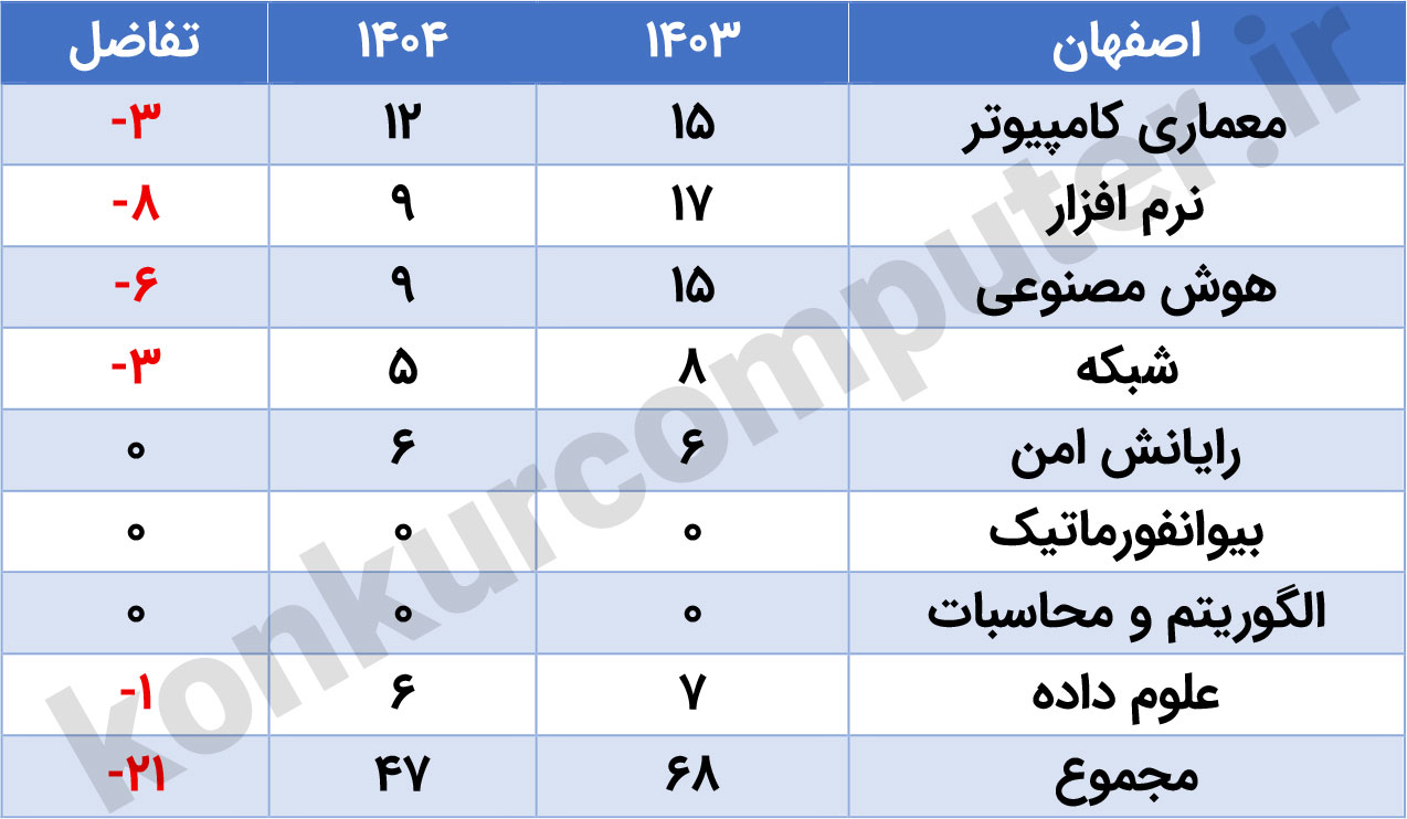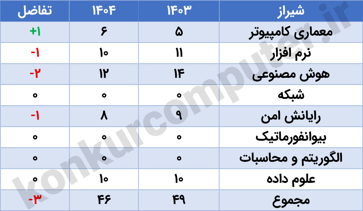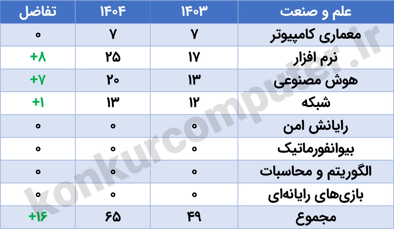 اگر فقط ظرفیت روزانه و شبانه دانشگاه های دولتی را در نظر بگیریم، ظرفیت گرایش نرم افزار 551، ظرفیت گرایش معماری کامپیوتر 285، ظرفیت گرایش هوش مصنوعی 531، ظرفیت گرایش شبکه های کامپیوتری 162، ظرفیت گرایش رایانش امن 90، ظرفیت گرایش الگوریتم و محاسبات 47 و ظرفیت گرایش بیوانفورماتیک 23 است.