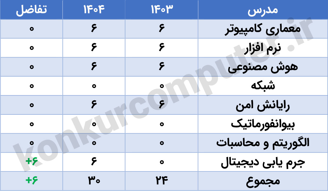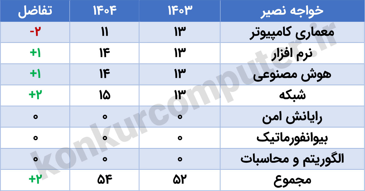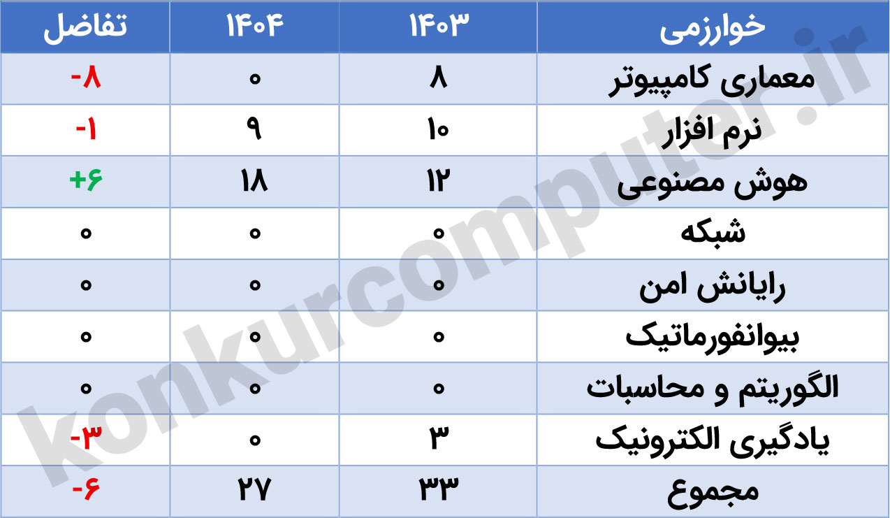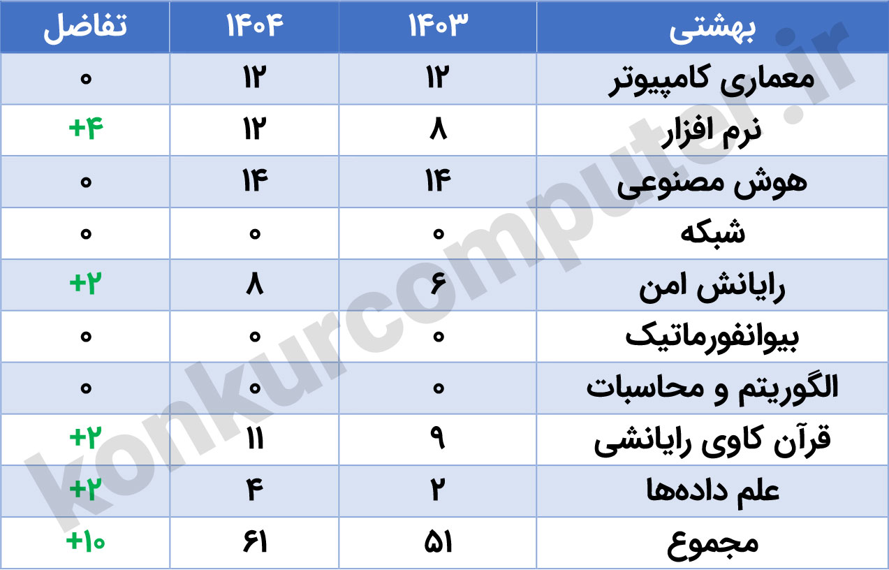 اگر فقط ظرفیت روزانه و شبانه دانشگاه های دولتی را در نظر بگیریم، ظرفیت گرایش نرم افزار 551، ظرفیت گرایش معماری کامپیوتر 285، ظرفیت گرایش هوش مصنوعی 531، ظرفیت گرایش شبکه های کامپیوتری 162، ظرفیت گرایش رایانش امن 90، ظرفیت گرایش الگوریتم و محاسبات 47 و ظرفیت گرایش بیوانفورماتیک 23 است.